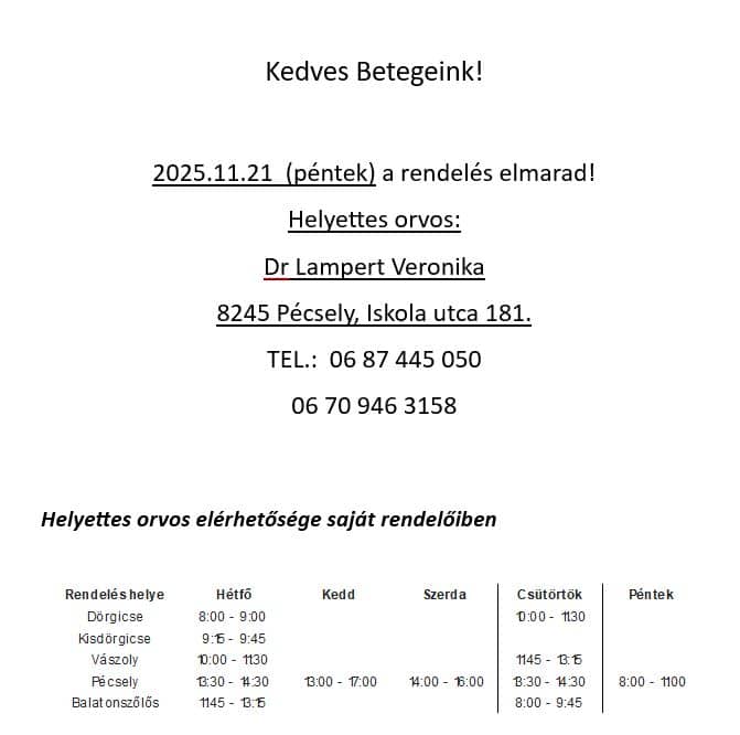 helyettes orvos: Dr Lampert Veronika Pécsely, Iskola utca 181 Telefon: 06-70- 946 31 58